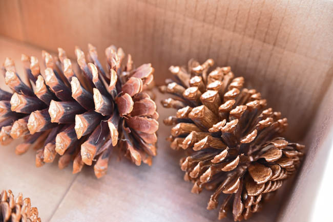 Prevent overspray – create your own “spray booth” by placing the pine cones in a medium to large cardboard box. This method helps the process go quickly, as you can allow an application to dry a bit and then shake up the pine cones and apply another coat at a different angle. Particularly if you are using a mix of paint colors, you don’t need the application to be perfectly even.