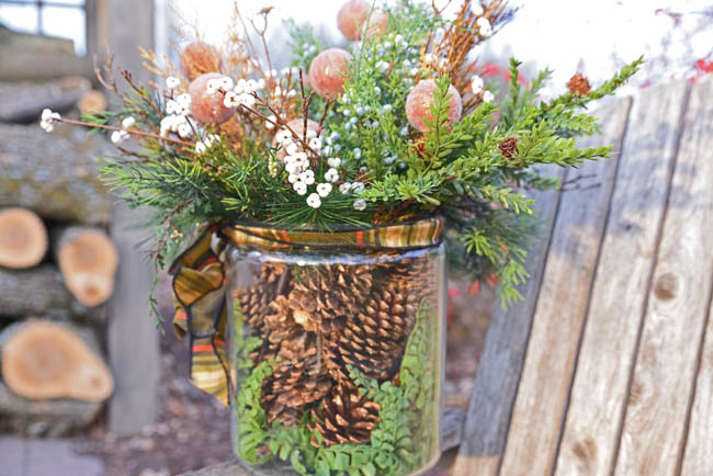 For the last couple of years I’ve used things from our yard to help round out holiday decorating – red twigs from dogwoods, branches from birch trees, and dried hydrangea blossoms. I can run outside and grab them when I have a few moments free (I’m much more likely to do that than I am to get in the car on a weekend and deal with holiday crowds). Plus, you can’t beat the price. This year I added pine cones to the mix. Spraying pine cones with metallic paint is super easy, helps preserve them, and adds some interesting dimension. For this arrangement, the pine cones were placed around the perimeter of a glass apothecary jar, artfully hiding the stems of the greenery and other items placed inside.
