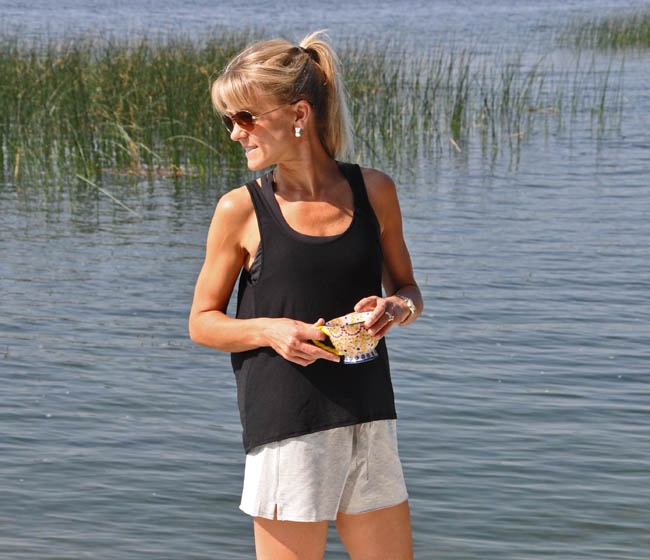 Lululemon shorts and tops | Target flip flops | Tory Burch sunglasses and earrings
