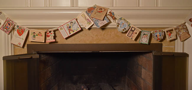 In early February of last year I walked into my parents’ house and immediately noticed the darling decoration she had hung from the mantle. She had made a garland with antique Valentine’s Day cards stitched onto ribbon. It was simple and sweet, just a tiny touch of themed décor for the holiday. It’s tough to muster up the energy to decorate immediately on the heels of a couple of months heavy with holiday décor, but adding just a little something singular can have big impact.