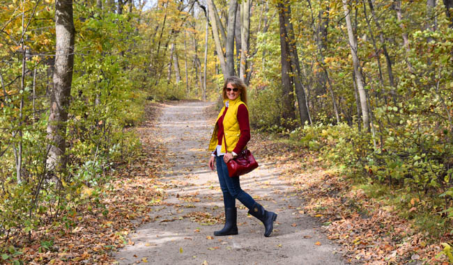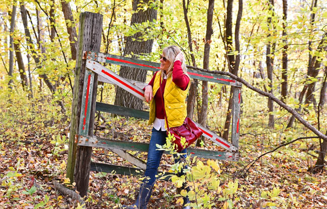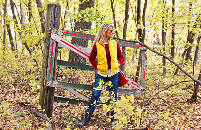 Reality Check. Trevor and I set off with the intention of finding a setting for a “fall colors” post (thus the red and yellow in the outfit). Going off of last week’s theme of visiting some old stomping grounds, we drove to the more “woodsy” area of the lake where my dad’s side of the family used to have a cabin. I’m not sure why if I didn’t see the bright reds and yellows elsewhere (the colors hadn’t really turned vibrant yet at this point) I thought we would find them where there was even less sunlight, but sometimes we don’t really think things through. Thank goodness for the chipped red paint on the old gate – the only real pop of color we found on our excursion!