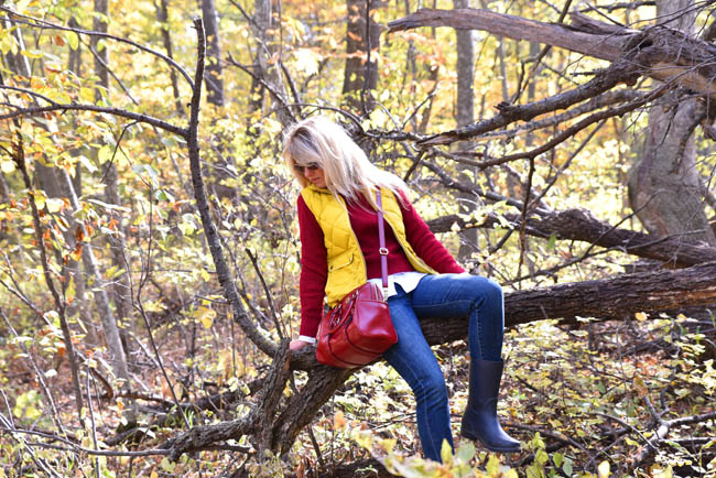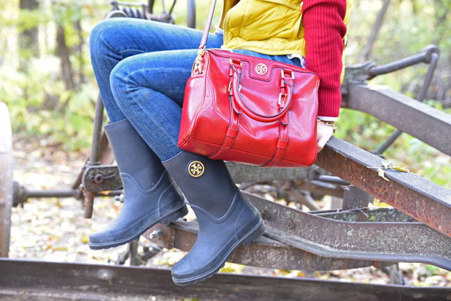 J Crew vest | Banana Republic shirt and sweater (similar here) | AG Jeans | Tory Burch sunglasses, boots, and handbag (this season’s red, here)