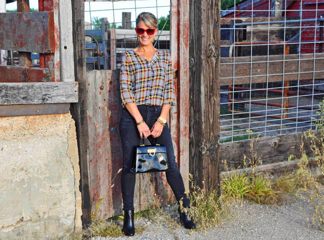 Peyton Jensen shirt | Citizens of Humanity jeans (now 20% off) | Banana Republic booties (extra 35% off today with code BRSHOP35) and sunglasses | Anthropologie earrings and bracelet | J Crew Necklace | Michael Kors watch | vintage Ferragamo purse