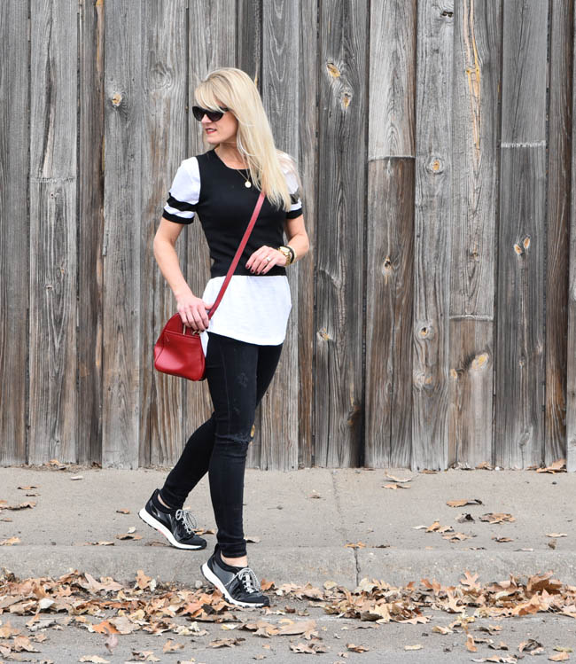 I bought this t-shirt a few weeks ago because it instantly reminded me of vintage sports shirts, and as is the case with most shirts, I love anything with a longer length. I figure if I’m not going to follow the NCAA tourney this year (not sure why, just didn’t), the least I could do is to dress a little sporty. I stole the sweater vest look right from the Banana Republic window and paired with some new sneakers that I love. Especially as it relates to the t-shirt and shoes, I see a lot of wear for these during this spring and summer.