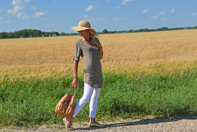 I know, I know, it’s a terribly silly play on words, but I really do love summer. Especially weekends like this last one. A day off with friends on Friday with amazing lake weather, followed by an intense evening storm that all but eliminated any chance for humidity the rest of the weekend. That lead to wonderful mornings and breezy days, comfortable enough on Sunday to throw on this tunic and pants and take a little drive in the beautiful countryside. I purchased this tunic thinking that the color and style would be best in the early fall, but I love to sport a little olive hue after a few sun-kissed days.