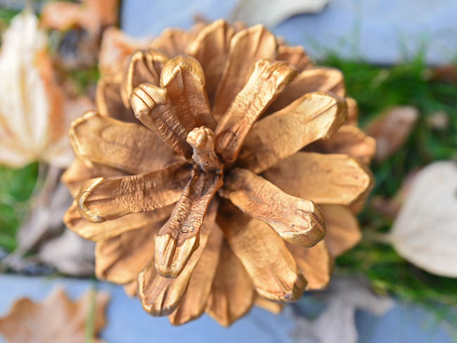 Prevent overspray – create your own “spray booth” by placing the pine cones in a medium to large cardboard box. This method helps the process go quickly, as you can allow an application to dry a bit and then shake up the pine cones and apply another coat at a different angle. Particularly if you are using a mix of paint colors, you don’t need the application to be perfectly even.