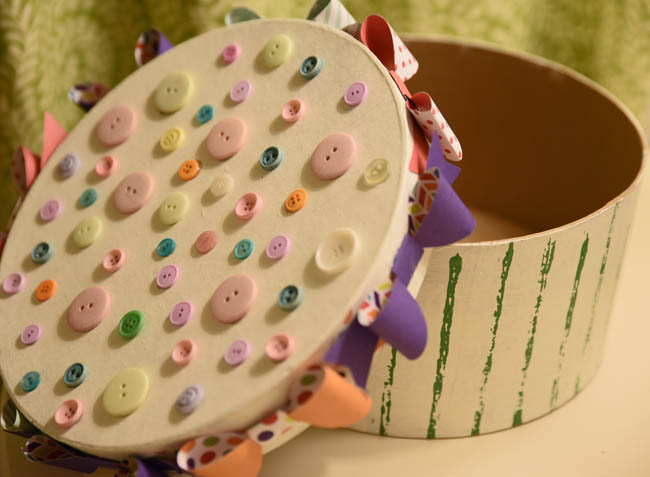 Reality check. This is a fast project, but allow at least one hour of drying time before gluing on the buttons and bows. Trying to rush the project just leads to a second coat of paint and even more paint on your hands as you handle the not-so-dry painted box.