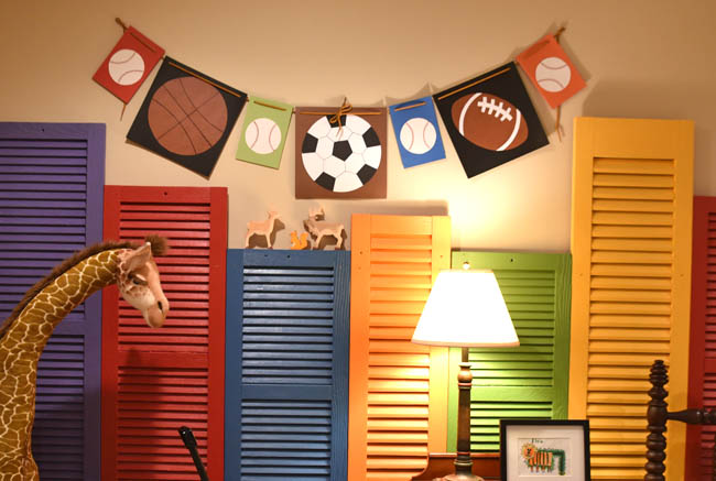 It’s always been pretty easy to come up with graphic decor for Taylor’s room. When in doubt, we turn either to superheroes or sports as a theme for him. And since the “hero du jour” is always a moving target, going the route of soccer, football, baseball, etc. is always safe. Those favorites have remained the same since he was a baby. Once again, I visited the world of scrap booking to find paper stock that would easily work for this project. I was even able to find paper that replicated the texture of a basketball. I turned to Sports Illustrated for images of the various balls and found them all in one issue. I mounted the shapes on heavy stock so they would support the weight of the image and hang nicely. I purchased leather boot laces to thread through the paper to amp the masculinity of the banner. One special touch – the seams of the baseballs were actually stitched on a sewing machine that had a herringbone stitch as a option (courtesy of grandma!). It added a realistic detail and nice variety in texture.