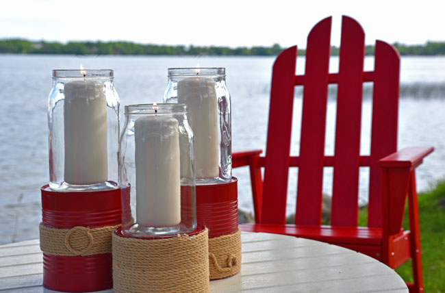 At least a few times a week a magazine arrives at our front door with a beautiful “Outdoor Living” spread displayed on the front cover. I’m always tempted to hop online to get the lovely lanterns, fabulous fire pits, dreamy daybeds, etc. to complete an outdoor oasis (especially at the cabin), but know that I neither have the budget to purchase nor the time to maintain those kinds of items. I do use the pictures, however, as inspiration for ways that I can mimic the look for a lot less. I love how these rope wrapped candle holders turned out, and you can’t beat the price of just a few dollars each. Materials and simple instructions below.