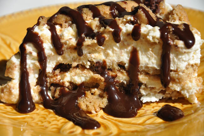 This “cake” is a go-to recipe for many occasions (recipe below). You absolutely should make this dessert. Your friends will swoon and your family will love you. Even more, that is. It uses only a handful of ingredients (one of which can be varied depending on preference) and must be made at least a day in advance, which is always a good feature for making entertaining easier. If you’d like to make it with chocolate chip cookies, as shown here, try my cookie recipe (link here) or if you’d like to skip some steps, feel free to use Toll House packaged cookie dough – those actually work quite well as they soak up some of the ice cream goodness. If you are more of a purist, use a package of chocolate wafers, which is the main ingredient in the classic version of this treat. If peanut butter is your thing, use Nutter Butter cookies and chocolate sauce, and crumble a Butterfinger bar on top for added crunch.