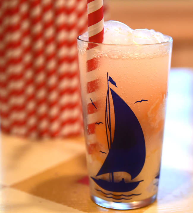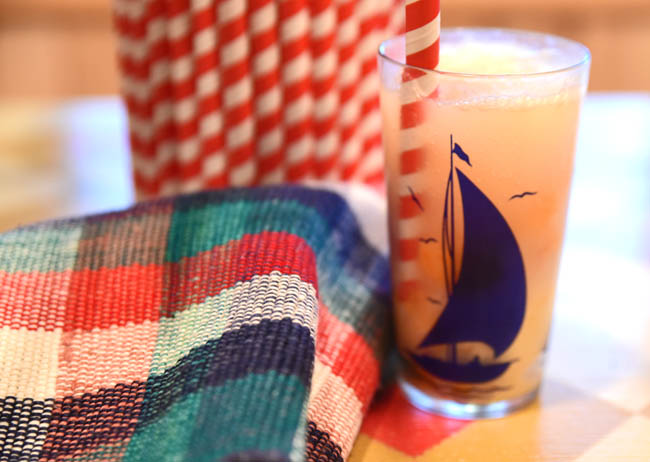 I’m always amazed how my mom can quickly whip up the yummiest of treats at the end of a meal just by grabbing things she has on hand. Often, the goodie evokes memories of a favorite childhood sweet, like with this creamy orange combo that is a grown-up version of the “Dreamsicle” frozen confection. Vanilla ice cream is always on hand at grandma’s house for my daughter Ella, orange sherbet for my dad, and club soda for drinks of other sorts. Simply combine equal parts vanilla ice cream and orange sherbet and top with club soda for a refreshing and delicious dessert. Leave unmixed for a float, or stir together (my favorite) for more of an old-fashioned soda. Serve in a nautical themed cute glass with a summertime straw for a special touch.