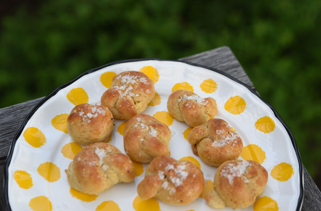 During the summer, when impromptu gatherings are much more likely to happen compared to the winter months, I like to have some go-to appetizer recipes for things that I can make quickly with items on hand. These garlic and sea salt knots are great because they’re tasty and easy to make, good for adults and kids alike, can be dressed up with great mustards and other dips, and the simple ingredients will keep frozen or packaged for long periods of time. I find that last part to be especially important when at the cabin – I can’t always haul out a full load of groceries, nor can I leave things out there that don’t have a shelf life. All of these ingredients can be kept in the fridge, pantry or freezer and used only when you want to make a quick, homemade, yummy snack. The recipe and simple steps are below.