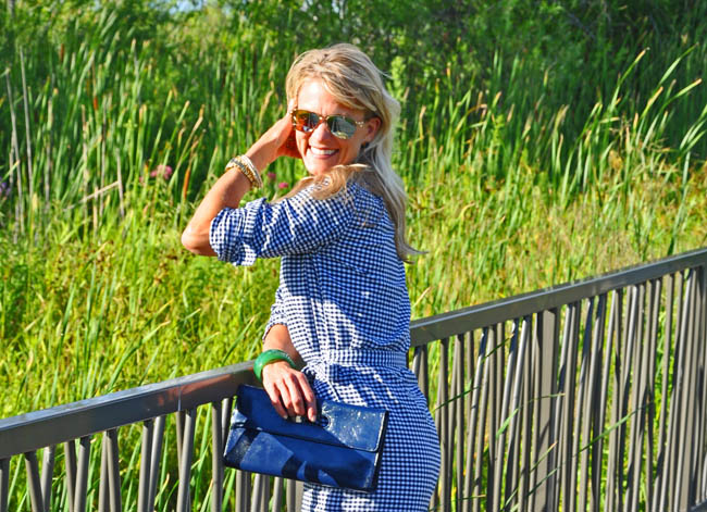 Gap dress (similar chambray version here) | Kate Spade earrings | Tiffany & Co. sunglasses Banana Republic necklace | Hobo clutch (in other colors here) | Michael Kors watch | J Crew bracelets, green cuff: old | Tory Burch heels (khaki here)