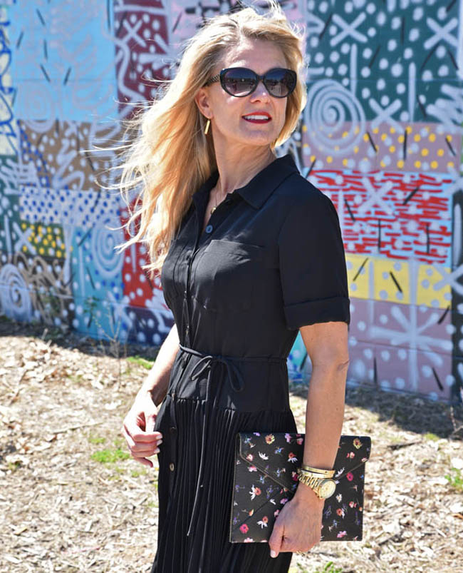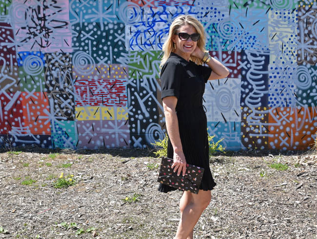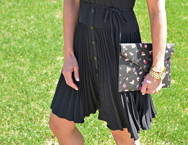 Nanette Lepore dress | Rebecca Minkoff clutch (same pattern similar style here, 65% off, and same style, plain black here) | Kate Spade necklaces and sunglasses (exact style sold out, similar on sale here) | J Crew earrings | Michael Kors watch | Madewell bracelet