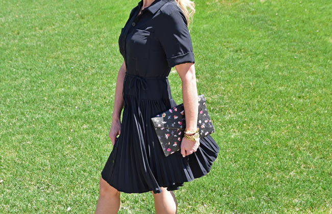 I needed something conservative and classic the other day for a work event, and reached for one of my favorite black dresses. Driving to the event I remembered a time I wore the dress while at the law firm, then realized that meant I’d had it well over a decade. I suppose some closet maintenance rules would dictate that the dress should be long gone, but I happen to love it when I make a purchase that can stand the test of time. No better bet for that than a great black dress. I think this one has a good chance of lasting through the years, as it is conservative but has enough detail to keep it interesting with the buttons, pleats and dainty tie at the waist.