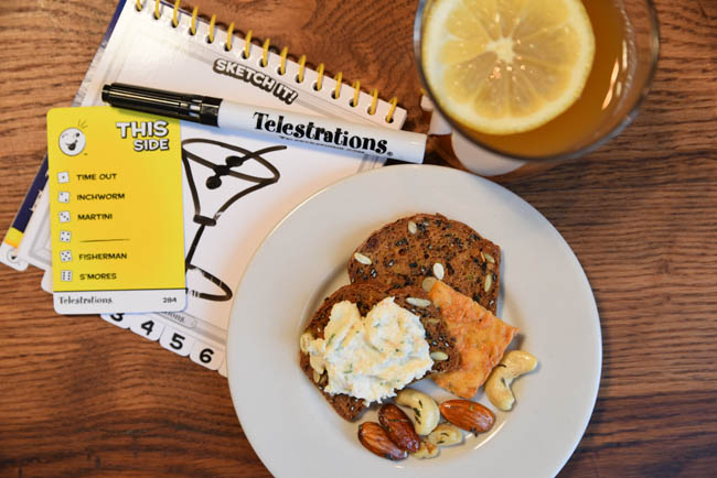 Reality Check. Yup, the photo above is staged. You can tell because (A) appetizers never look this organized on a plate and (B) never during this game did one of us get assigned the task of drawing something as easy as a “martini.” The game was Telestrations and it was a ton of fun – so much so that I forgot to take any shots of us playing the game. I highly recommend it for the holidays with friends and family. It’s a mix of Pictionary and a good ol’ game of “telephone” – one person starts with drawing the photo and passes it to the next to guess what it is and write it down, followed by the next person drawing what the prior person wrote down on the pad, and so on. Again, the “martini” clue doesn’t do it justice, but it’s hard to recreate the picture of an ant hill that Trevor began a round with, which ended up “supply and demand” by the time the notepad circled back to him.