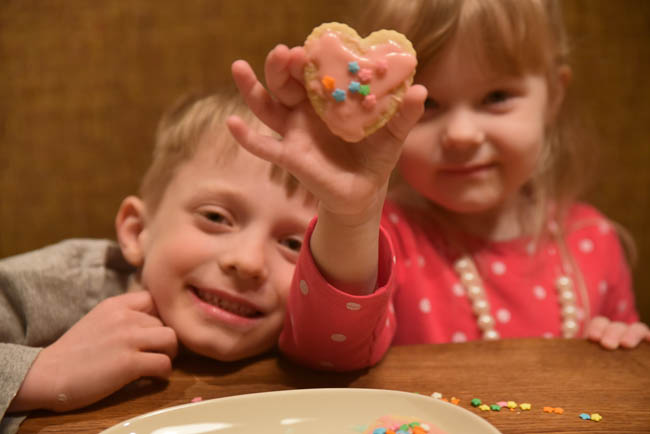 I had some goodies on hand from last week’s recipe post for roll-out sugar cookies (link here), which proved helpful as we looked for good indoor activities during our recent cold snap. On these cold weekends the days can seem especially long when the kids are cooped up inside all day, and it gets tempting to pop in a movie to keep them occupied. On this particular night it was right before bath and bedtime and I gave them their choice of watching a show or decorating cookies – they jumped up and down at the latter option. I mixed up some simple powdered sugar icing (1 cup powdered sugar mixed with 1-2 tablespoons milk), gave the kids some food coloring and sprinkles along with the cookies, and let them go to town.