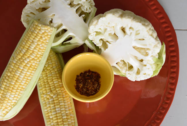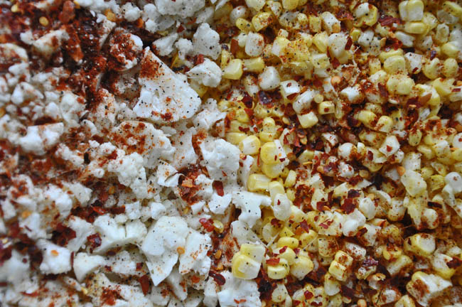 Toss corn and cauliflower in olive oil and spices, then top off with salt and pepper (for extra kick I added a dusting of the other spices as well)