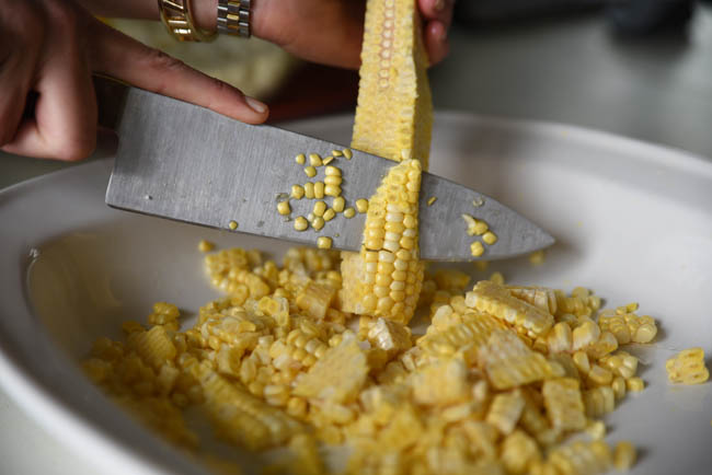 To cut the corn, place one end in a bowl and slice off the kernels. If you are doing more than a few ears of corn, turn a second, smaller bowl upside down within the larger one, and slice (so the kernels fall into the larger bowl).