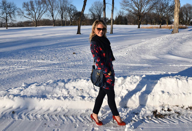 Reality Check. This was the second attempt at photos with this outfit (well, most of its components, anyway). A couple of weeks ago I had paired the top and pants with a dark navy scarf, reddish heels and dark sunglasses. It looked terrible. Truly, I’m not sure what I was thinking. Evidence below (the dirty snow plow tracks were a nice touch).