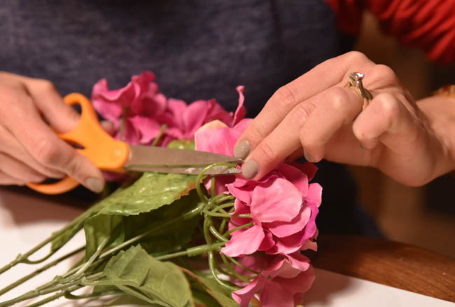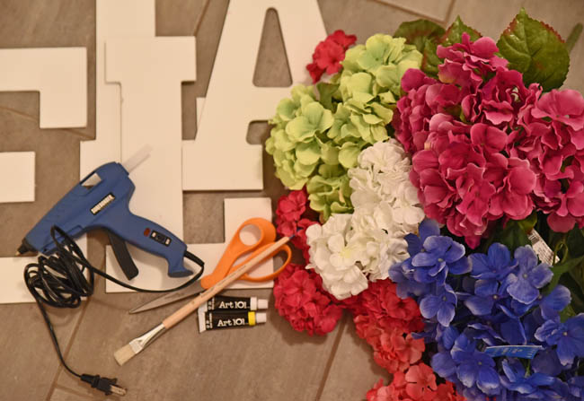 Materials needed (for the letters): lightweight wooden letters (I purchased these at Michael’s, link here); artificial flowers (I think the hydrangea blossoms are the best for this type of project and come in a variety of colors, also purchased at Michael’s); acrylic paint and brush; scissors; and hot glue gun. Materials needed (for hanging): painters’ tape; 3M Velcro mounting strips; level