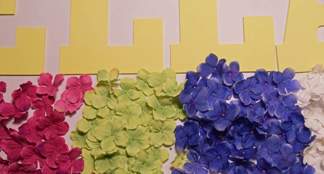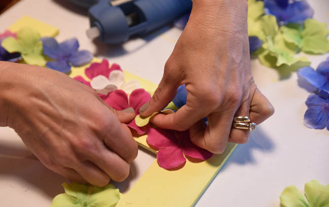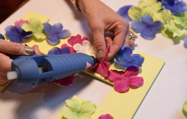 Place a dab of hot glue in the center of the flower, and affix to the letter.
