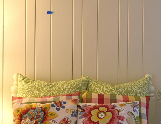 With painters’ tape, mark the spot on the wall where you would like the top of the letter to hit. Remember to have whatever else will be in place under the letters as it will be when finished (for example, if I took the pillows off the bed while finding the placement for the letters, they would end up being too low on the wall in relation to a made bed).