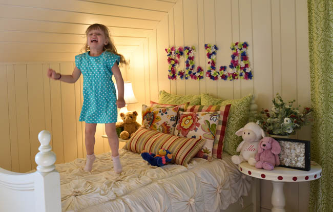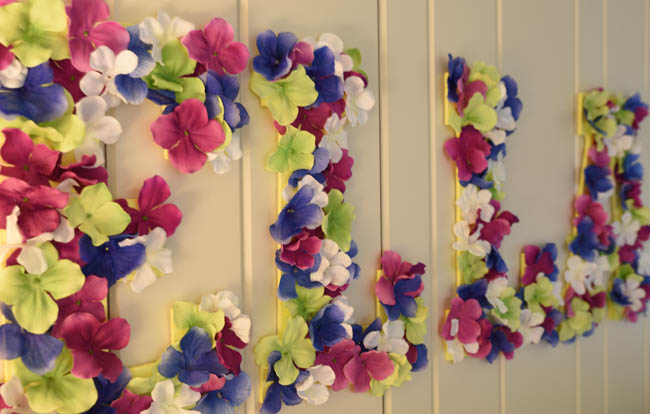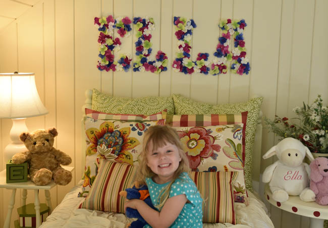 Reality Check. The jury is still out whether these will stay. Ella LOVES them (so that probably answers the question) but I’m a little on the fence. Although I loved how easy the project was and love the result, once in the room the colors were a little more vibrant than I had expected, and I’m obsessing a bit over whether they are exactly level (difficult to tell with the petals overlapping the edges of the letters). I will wait until I pull the room completely together before I make the final call and presume by that time (1) they will have grown on me and (2) there will be no convincing Ella to put something else in their place.