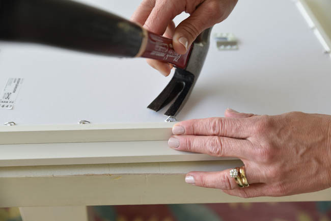 Step 4: Disassemble the frames. This is the most tedious part of the project, as those Ikea folks sure were happy with the staple gun on these. After trying a couple of different methods, the best route is to use a thin nail with a hammer to loosen the staples (pictured above), then pry them out with the claw of the hammer (pictured below). You may find you have some stubborn pieces of the staples, which can be taken care of with a needle-nose pliers.