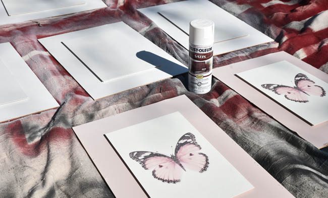 Step 5: Paint the mats (if desired). The bottom mat was a taupe color that didn’t work well with the flags, so I spray painted them ivory to blend with the frame and the wall. The mat is glossy so didn’t soak up the paint, which worked well. Give them a second coat if needed once dry to the touch, then let completely dry (which happens in a matter of a few hours).