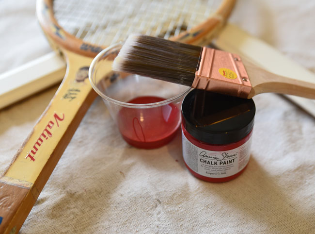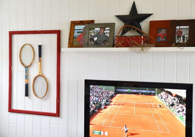I recently saw a couple of great looking framed tennis racket prints at Restoration Hardware (links here and here). Although they are currently around 50% off, at $245 a piece that’s still too much for the space I want to fill at the cabin. I decided to mimic the look with some antique tennis rackets collected over the years by my mom and sitting on a shelf with plenty of other sports memorabilia in Taylor’s room (in other words, I didn’t think he would miss them). I purchased a large frame at Ikea, removed the glass and mat, changed up the color with some chalk paint (some detail on that, below) and hung the two rackets in the center. An easy, very inexpensive DIY wall décor that fills a large space with big impact. It’s perfect at the cabin where I want to avoid having all décor lean in the nautical direction. More detailed steps included below.