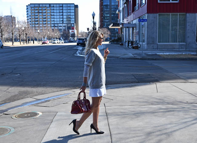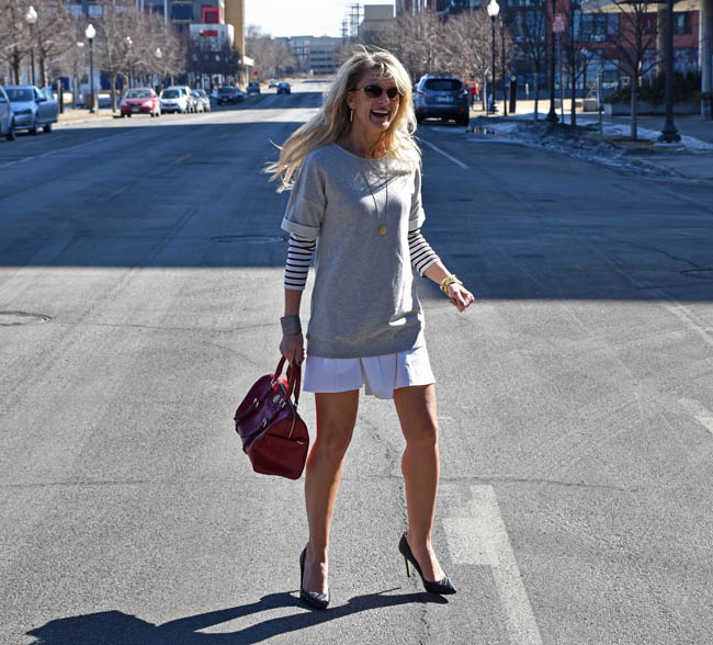 Fun and flirty – now those are two words that I rarely, if ever, use to describe my outfit. More common combinations are things like “conservative and workplace appropriate,” “machine washable and kid friendly” or “comfy and cozy” (the last combination applicable to everything I wear after 8:00 p.m., 95% of the time). But for some reason this dress kept catching my eye when I would walk by it, despite its basic gray and white color scheme. I think it’s because it reminded me of a tennis outfit, with the pleats that naturally formed in the skirt, coupled with the sweatshirt material on top.