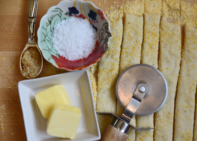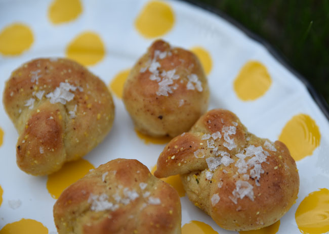 During the summer, when impromptu gatherings are much more likely to happen compared to the winter months, I like to have some go-to appetizer recipes for things that I can make quickly with items on hand. These garlic and sea salt knots are great because they’re tasty and easy to make, good for adults and kids alike, can be dressed up with great mustards and other dips, and the simple ingredients will keep frozen or packaged for long periods of time. I find that last part to be especially important when at the cabin – I can’t always haul out a full load of groceries, nor can I leave things out there that don’t have a shelf life. All of these ingredients can be kept in the fridge, pantry or freezer and used only when you want to make a quick, homemade, yummy snack. The recipe and simple steps are below.