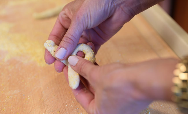 Roll out the pizza dough and cut into strips, about 6 to 8 inches long.