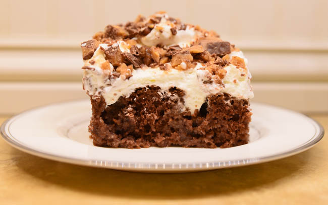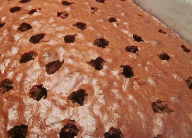 IMG_1099_edited-1The secret to this cake’s crazy yummy texture. See directions below for the details of how, when and why you need to punch a bunch of holes into a perfectly good chocolate cake.