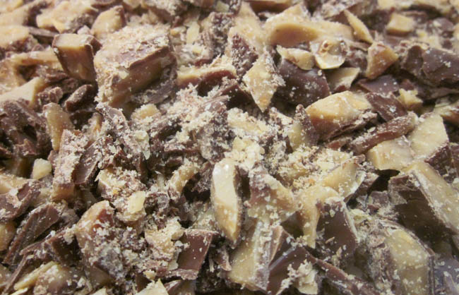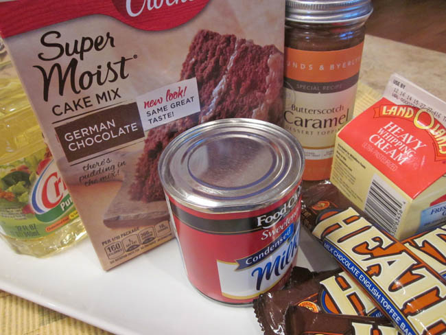 Bake German chocolate cake according to package directions. While the cake is still warm, punch holes in the top of the cake with the end of a wooden spoon halfway down through the cake, about 1 inch.  Fill the holes halfway with sweetened condensed milk and halfway with caramel sauce.  Whip cream to soft peaks.  Add sugar and mix to dissolve. Frost cake with whipped cream and top with chopped toffee pieces just before serving.