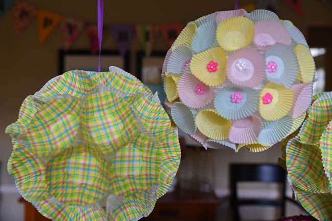 Remember the Cupcake Paper Lanterns post from last Friday? This is round two. With enough liners to cover the whole globe this time around and some embellishments at the center of the pale pastel ones, which I thought needed a little boost of color.