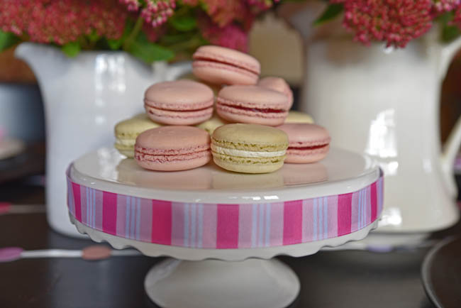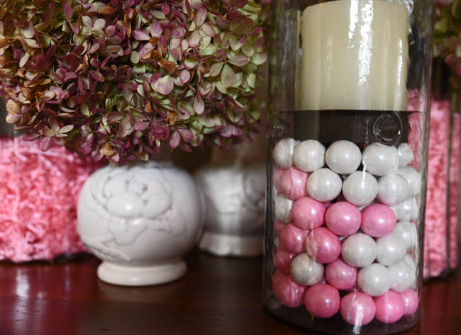 I added gumballs and pink shredded paper to the bottom of these hurricane lanterns to take them from dining décor to pink party accessories. The flowers are from my garden – the Limelight Hydrangea cooperated by turning a perfect shade of pink this fall. These were a great color (not too pink, not too bright) and best of all – free.