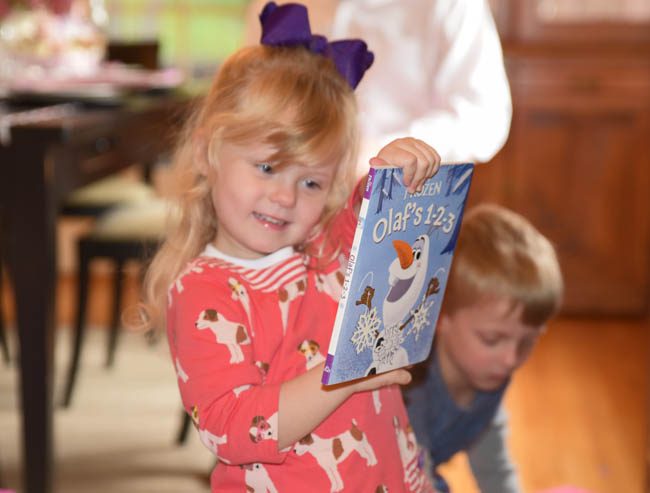 Olaf! Ella loves Frozen and loves books, although she rarely lets us read to her. “Me do it myself!” she’ll snap as she swipes books out of our hands. She’ll either be a fabulous reader or completely illiterate.