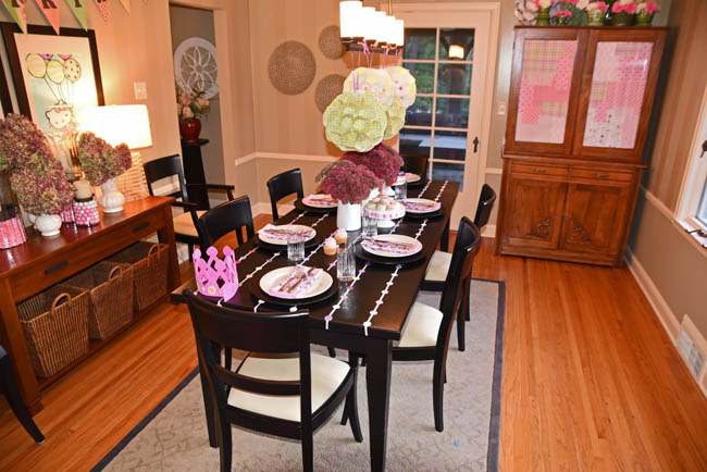 Full room view, showing projects detailed above (including getting a second use from the streamers on the table), as well as the tip of the birthday banner (post here) and the decorated cabinet in the corner (I did a patchwork design with craft paper on the glass doors and added pops of color with artificial flowers in the vases above).
