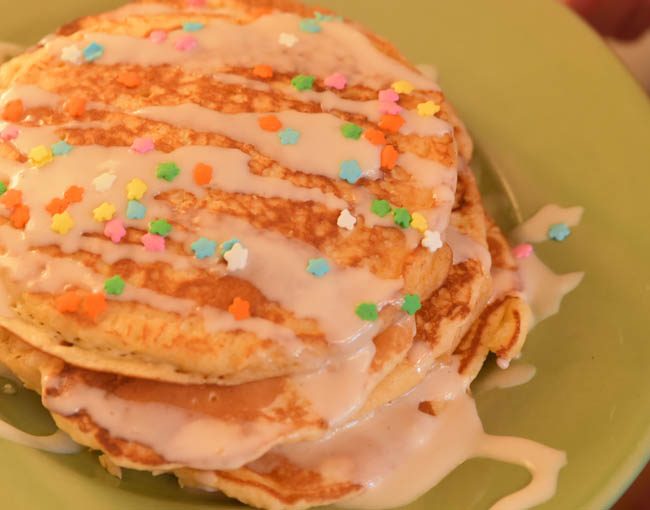 Funfetti pancakes. I spotted these on the Six Sisters’ Stuff blog several weeks ago (recipe in link) and knew they would be a hit “meal” for Ella’s birthday. Why not have cake batter incorporated into a pancake, topped with frosting and sprinkles? Super sweet, but super good.