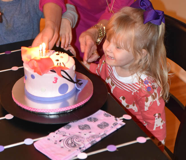 Ella as she walks through the polka dot party streamers she helped me create (stay tuned for Friday’s DIY post for more on this project, perfect for little hands). We hung these from her door frame so she saw them first thing in the morning on her big day. Note the polka dots on her PJs. Not in a MILLION years could I have convinced her to wear these if that was indeed a plan for pictures. Just a happy, sweet coincidence.