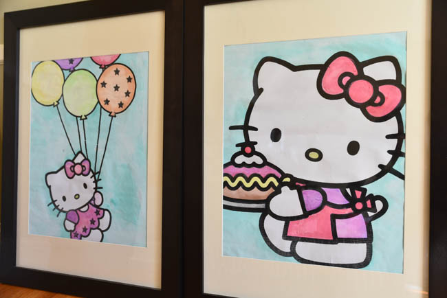 These two Ikea frames usually hold other “artwork” but for the party I printed large scale coloring pages (many sources, but an example here) and had Taylor (who loves art) paint them with watercolor. Free artwork with huge impact – visually and emotionally! What a sweet big brother.