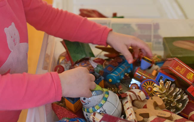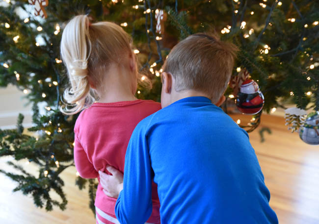 here) you know that I wasn’t exactly on the ball this year with getting our tree purchased, up, and decorated. But we had success this past weekend, and it was great to have an activity with the kids since the dreary rain thwarted our efforts to head outside for a little skating or sledding. My decorating style for Christmas trees has gone through a number of transitions through the years. All white and glass ornaments when we didn’t have kids, no ornaments the years where it was just too tempting for the kids to pull them off (which, coincidentally, were the years when I was exhausted from having a baby under age 1), and for the past few years, a combination of glass, tin, and wood ornaments. I store the tin and wood ornaments in a separate bin so that it’s easy for the kids to shuffle through and pick out those that they would like to hang.