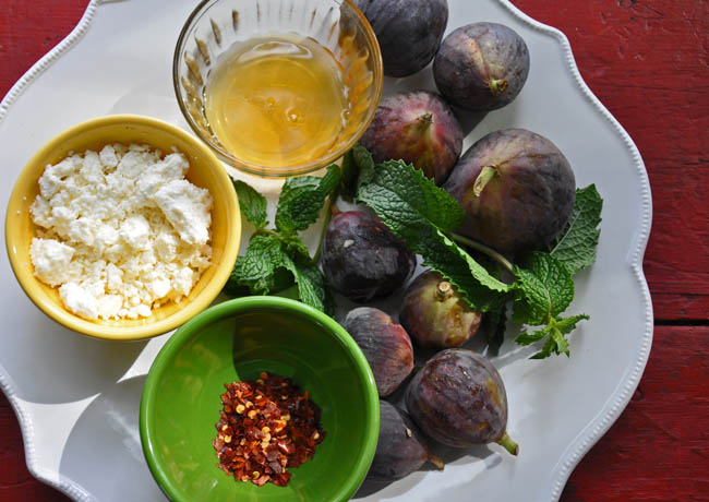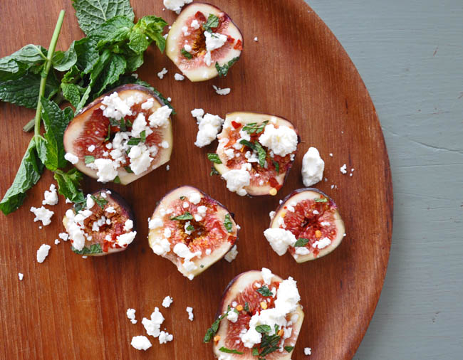 Slice fresh figs, drizzle with honey, top with feta cheese, chopped mint, and hot pepper flakes.