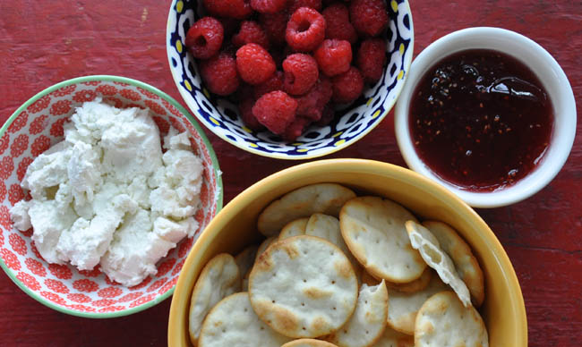Several weeks ago I was looking for something or other at Anthropologie and started flipping through the cookbook, The Forest Feast (link here). I loved the stylish photography, great artwork, and simple instructions. I purchased the cookbook, and have been happily perusing it ever since. I thought this fig appetizer recipe looked delightful, and not just because it didn’t involve turning on the oven. I paired these goodies with some spicy raspberry bites, made simply by topping a cracker of your choice with a bit of goat cheese, a fresh raspberry and dollop of jalapeno raspberry jam. Yum.