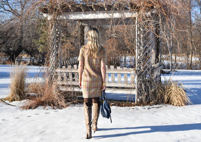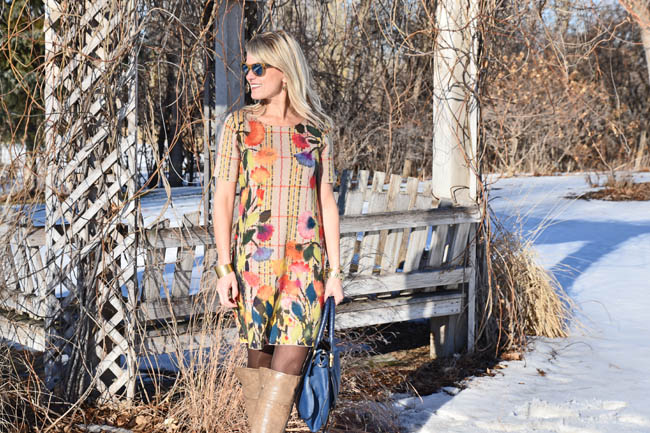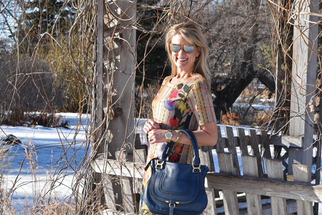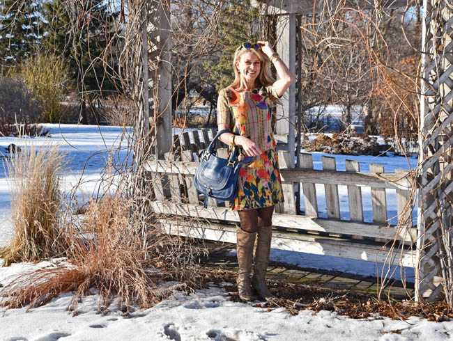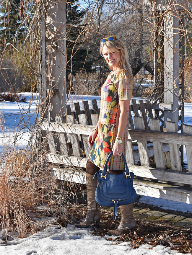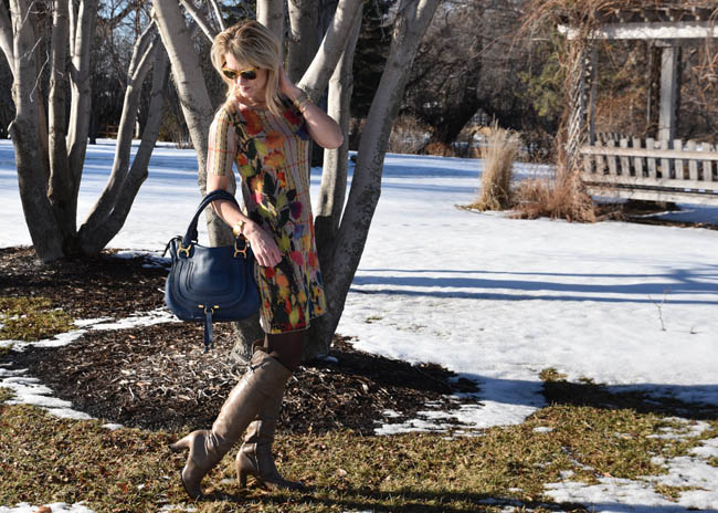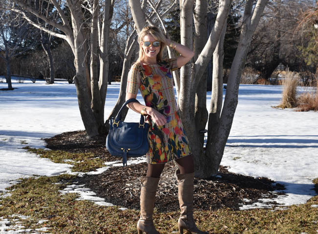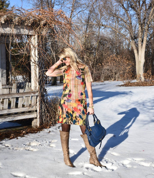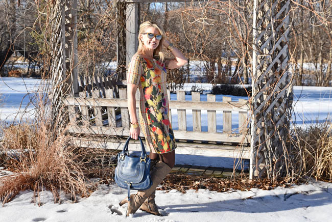 Anthropologie dress | Chloe handbag | Michael Kors watch | Madewell bracelets (here and here) | Pelago cuff | boots (old) | Ann Taylor tights | Ray Ban sunglasses | Anthropologie earrings