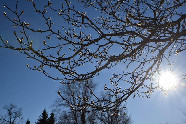 I pretty much rule out purchasing anything short sleeved in the winter months, as it’s just too chilly in Minnesota.  But I loved this dress for the soft and varied colors, the comfy fabric and the interesting pattern shift between the front and back. It helps that we’ve had some days in the past few weeks so warm that even the buds on some of the trees are confused (see picture below), making me want to reach for an outfit such as this as opposed to the usual uniform of layers upon layers.