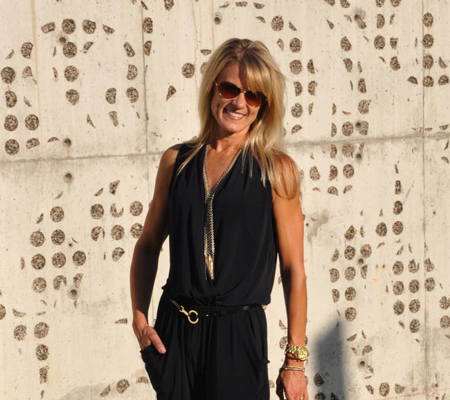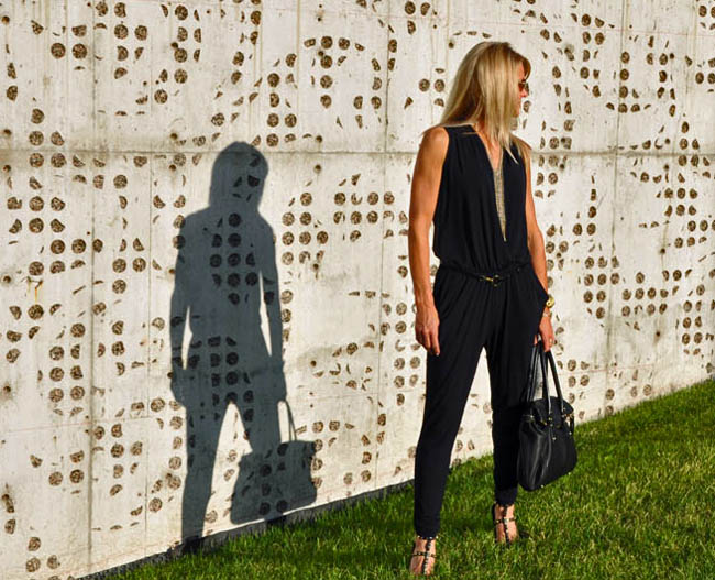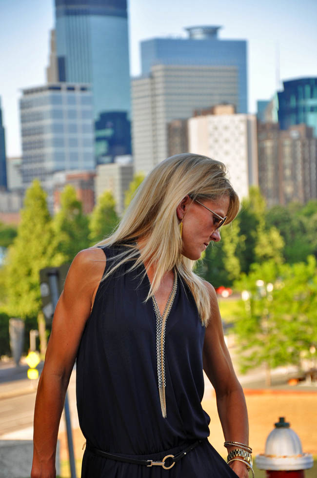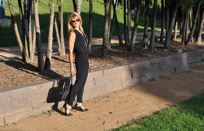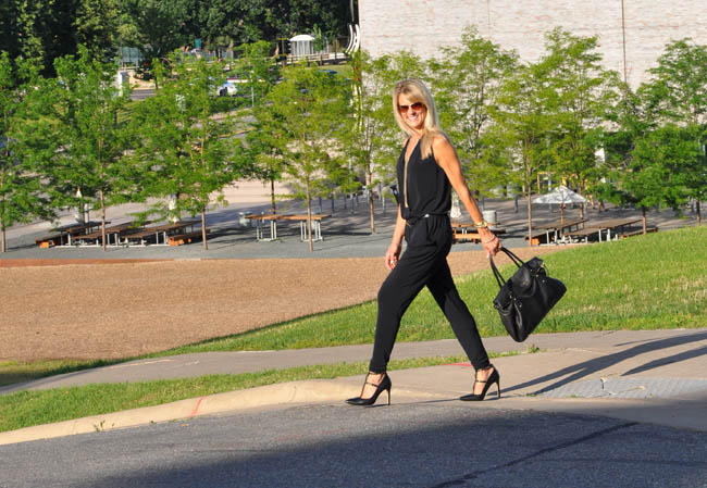 Ella has a gray stripe romper that has “FUN” splashed across the front. I’m not sure what it is about this particular romper, but it makes everyone smile.  It also makes every woman who has seen her in it say something along the lines of “I could never pull off something like that.”  That is my overriding thought when I see any romper/jumper.  A few months back I convinced myself (with some help from the lovely ladies at the store) to buy this basic black jumper. It sat in my closet for quite a while, but I thought I would give it a whirl on a recent date night. I highly recommend date nights (see “Checking In” post here) but admit that they can be tough to pull off – rushing home from work, getting the babysitter set up for some level of success, and heading out to a dinner reservation leaves little time for prep. A jumper is a nice alternative to a dress but has the same time-saving benefit of not needing to figure out a top to go with a bottom.