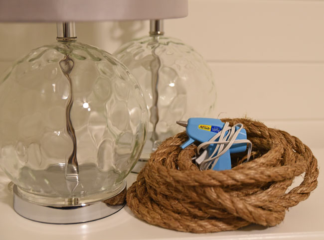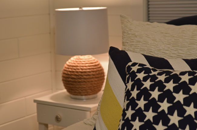 I am much more of a night owl than Trevor, so we like to have a lamp on each bedside table – that way if he turns in early, I can keep a little glow on my side of the bed. For the cabin I wanted to keep with a nautical theme, and was looking to have them be unique and interesting on their own since space issues dictate that the lamp is the only item on the table one side. I purchased two inexpensive lamps from Home Goods (if I remember correctly they were $20 a piece – with shades) and some jute rope from Home Depot. Grabbed the glue gun and in just an hour or so had two fantastic lamps for our bedroom. I love the texture and how the round shape contrasts nicely to the straight lines of the wood walls. Simple instructions are below, but if you are in the mood to skip the DIY aspect, some cute options are here and here.